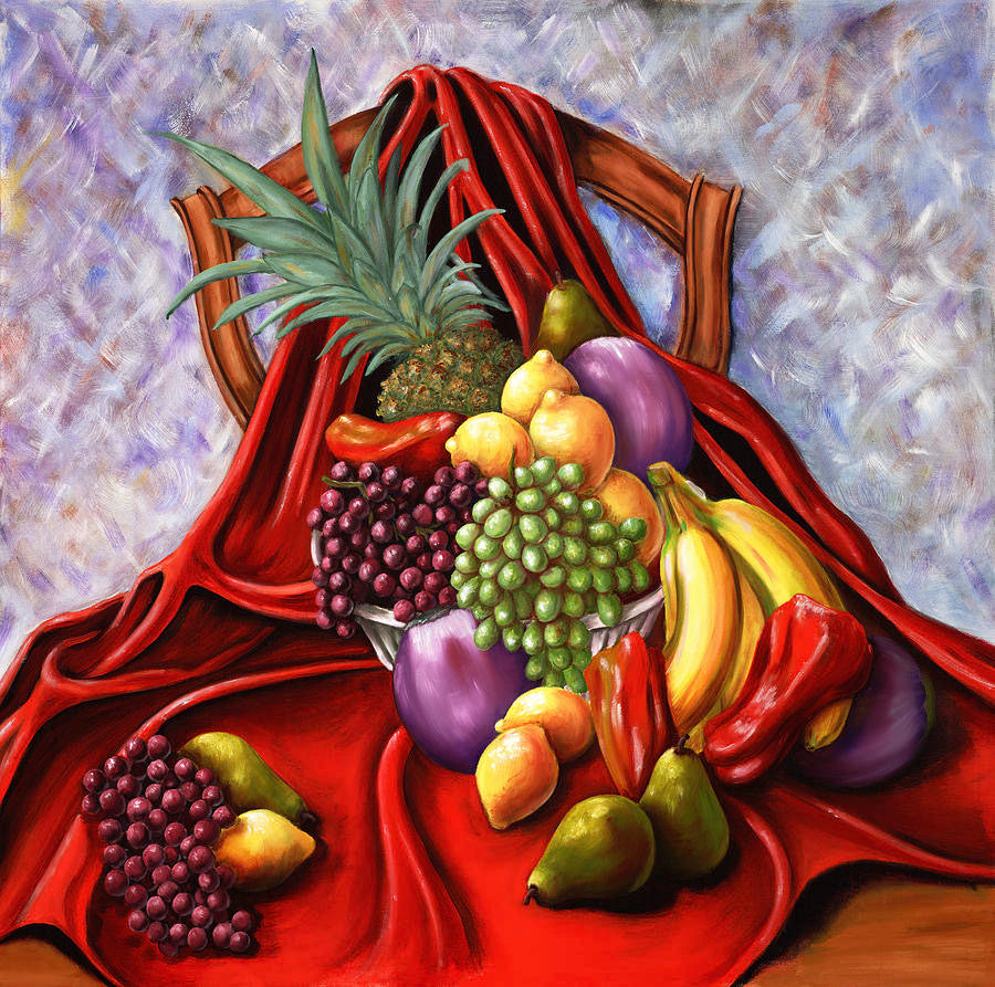 Abondanza captures the Italian spirit of joy, family, and the beauty of simple abundance. This 40 x 40 oil painting bursts with vibrant summer fruits and vegetables layered over rich red drapery — a sensual play of light, texture, and realism. Every detail, from the sheen of the grapes to the folds of fabric, invites you to touch, taste, and celebrate the fullness of life.
