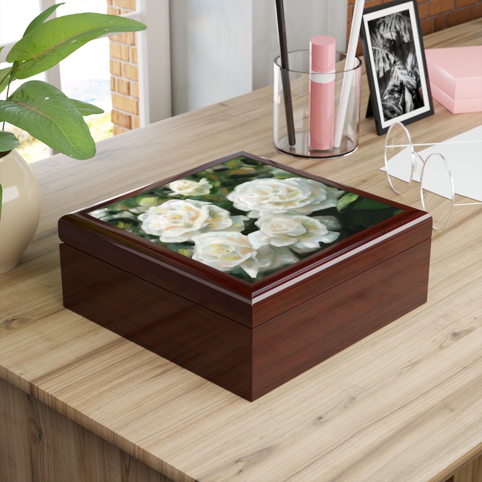 This glossy wooden jewelry box brings quiet elegance to a dresser or bedside table. The hand-finished rubberwood case holds a soft felt-lined interior that cradles rings, chains, and keepsakes. A 6" x 6" glossy ceramic tile, printed with painterly white roses, sits inset on the lid and catches light like a small framed painting. Dual hinges hold the lid open at 90° for easy access, while the slip-resistant felt base keeps the box steady on smooth surfaces. Choose from three rich gloss colors to match your room and let this piece become the place where daily jewelry rituals start and end.