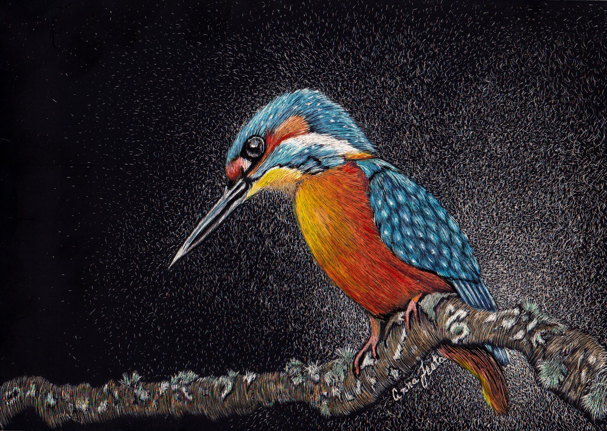 The Watcher is a 5 x 7 colorized scratchboard artwork that captures the quiet intensity of the Kingfisher—a master of patience and precision. Each mark is carefully scratched into a black clay-coated board, revealing fine details that give the bird its lifelike depth and texture. Once the image is fully revealed, color is delicately added to enhance the brilliance of its vibrant blues, warm oranges, and golden tones.