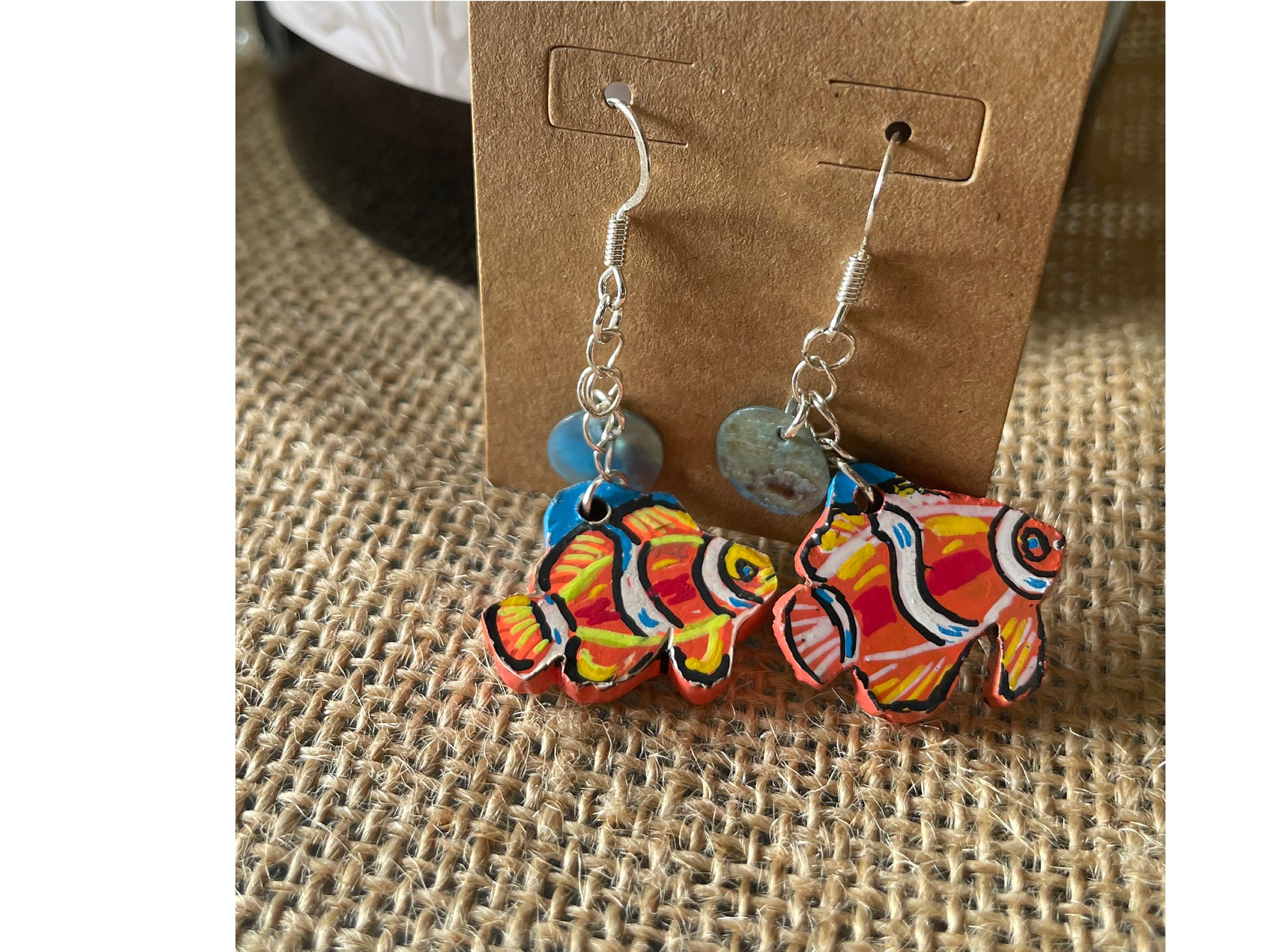 Bring a splash of the ocean to your day with these hand-carved and hand-painted clownfish earrings. Each tiny fish is uniquely detailed in bright coral orange, sunshine yellow, and sea-blue tones — no two are exactly alike. Inspired by the vibrant reefs where color and life dance together, these earrings capture the joy and playfulness of the sea. Lightweight and full of movement, they’re perfect for beach lovers, ocean dreamers, and anyone who adores handmade art that tells a story.