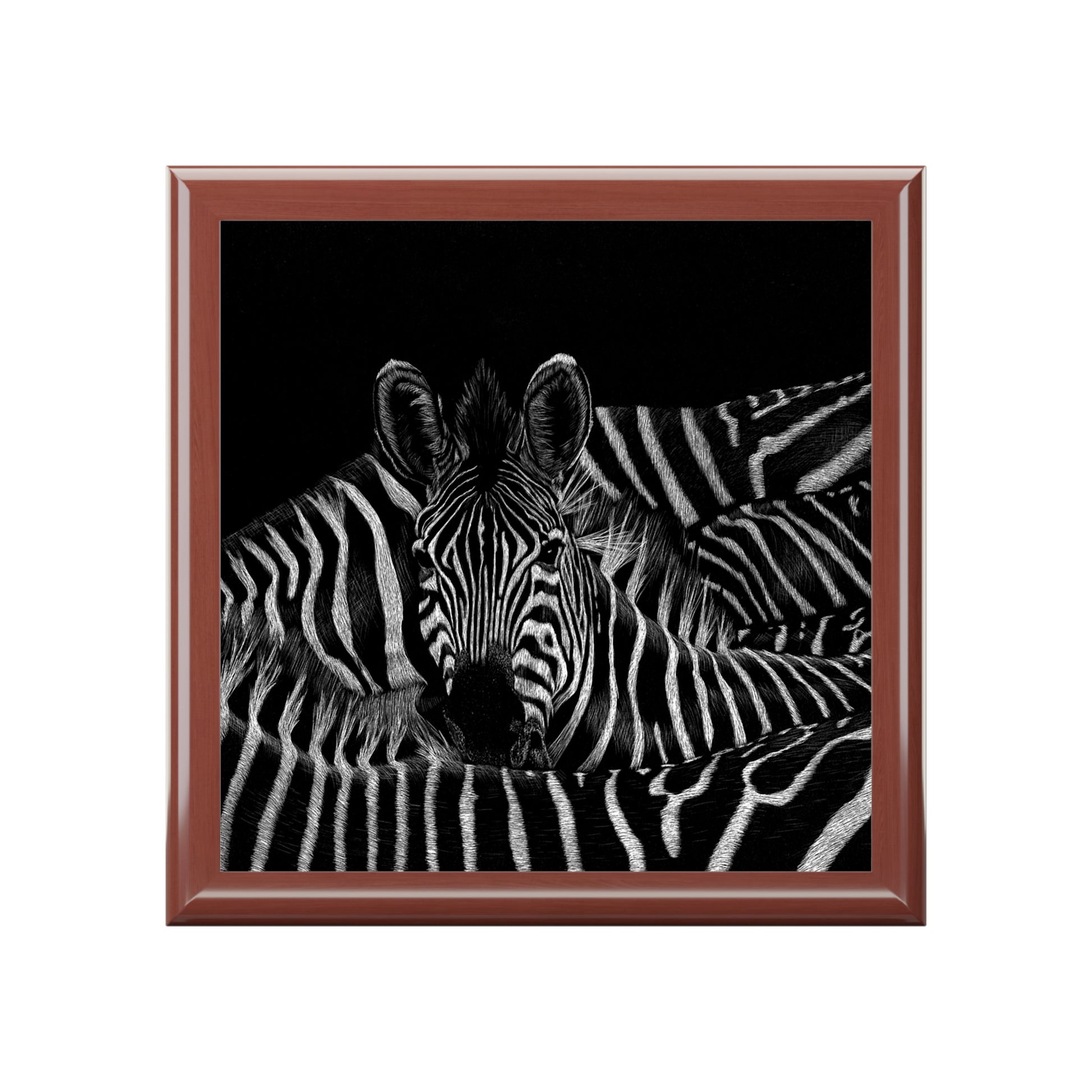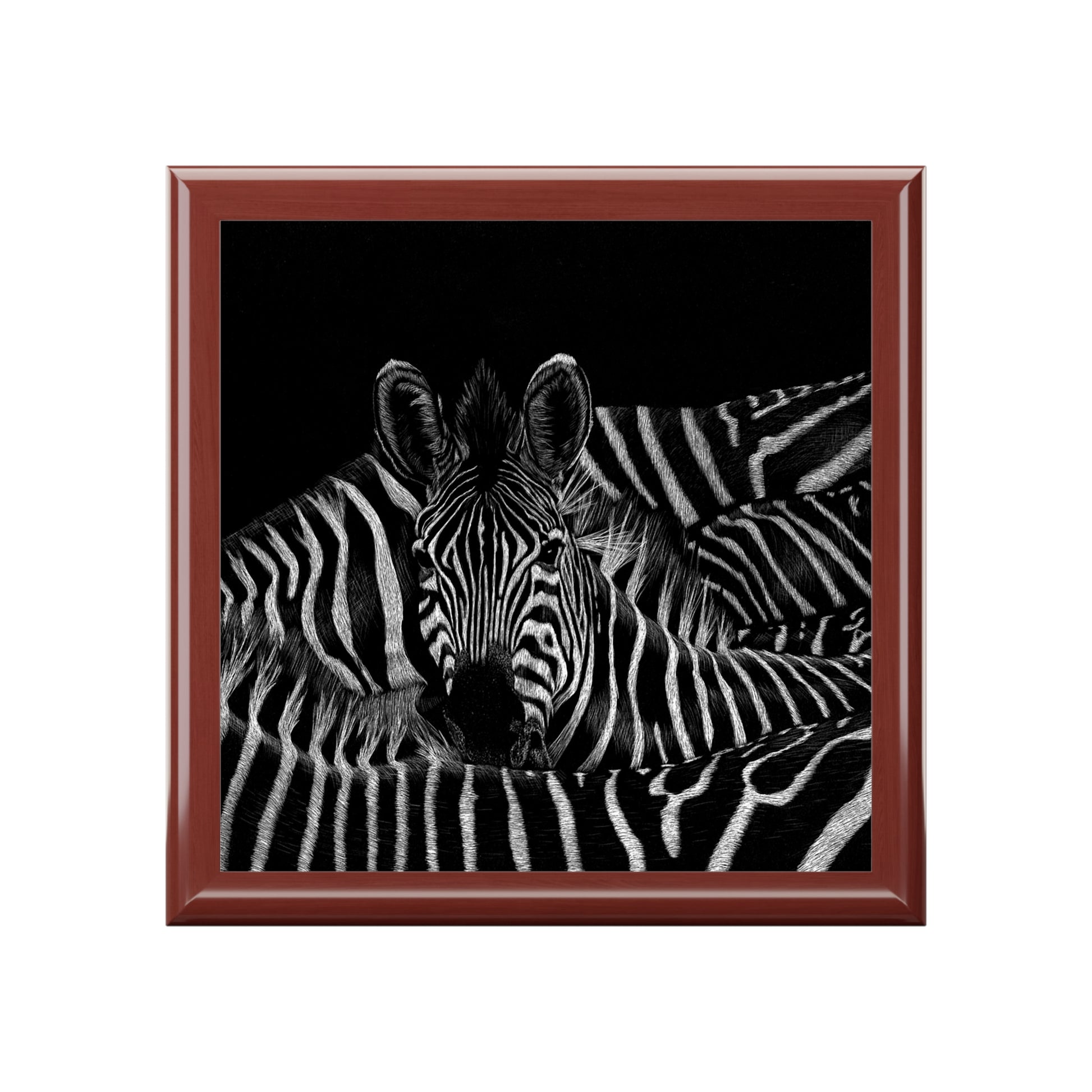 - 6" x 6" glossy sublimation ceramic tile on the lid featuring zebra artwork